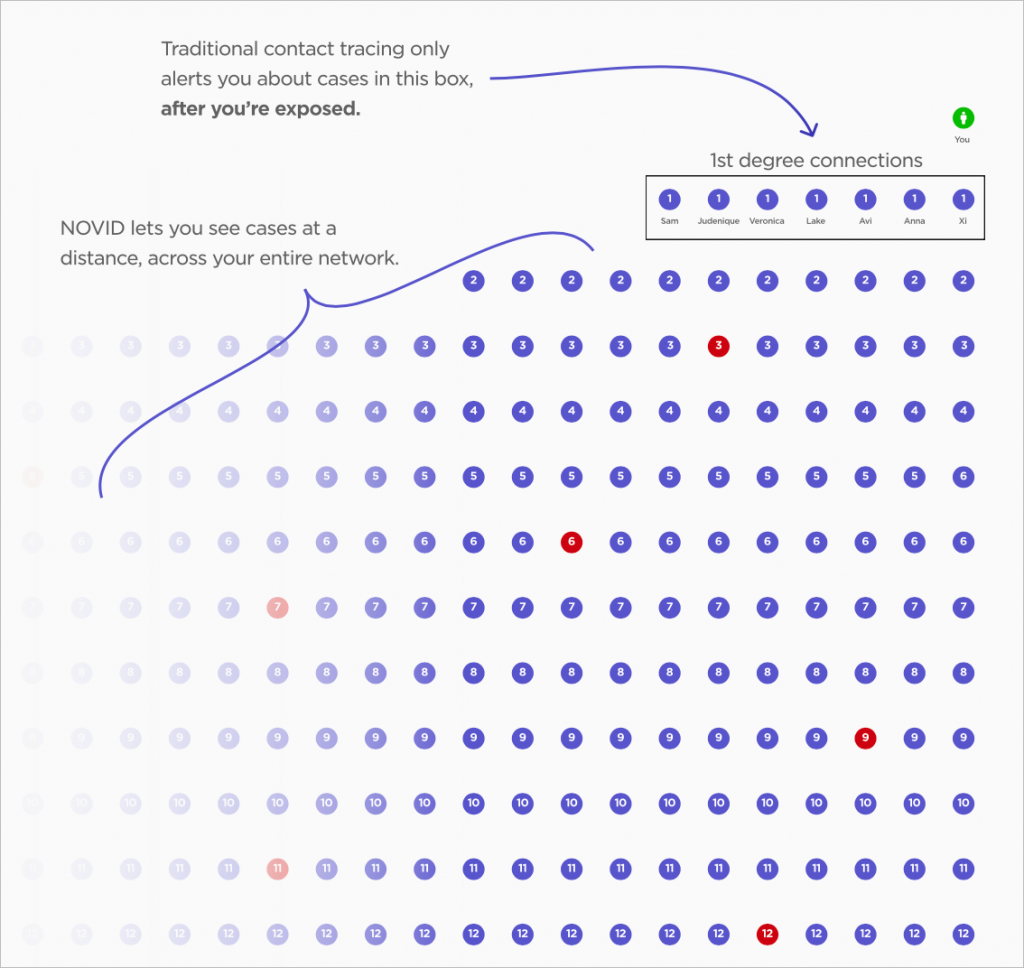 However, where the Apple/Google technology notifies you only if you have been directly exposed at some point in the past, forcing you to quarantine and get tested, NOVID helps you look into the future and evaluate your personal risk of being infected. That’s because the Apple/Google technology stops at 1 degree of separation—you only learn about exposures to people with whom you have directly interacted, and only well after the fact. NOVID goes way beyond that, tracking infections out to 12 degrees of separation and showing you how far away they are.